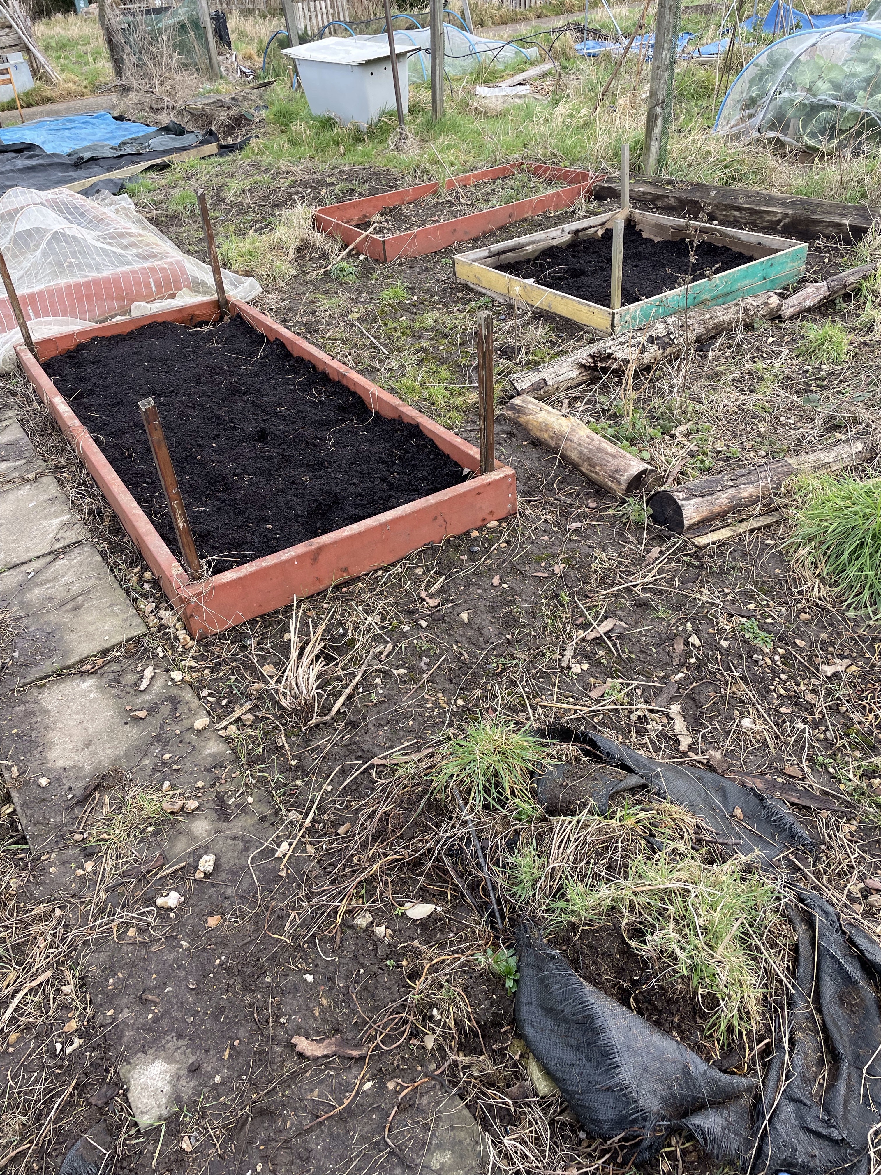 Anyway, moving on from that. I dug over a couple more raised beds and added some more compost. This time I also covered up some more of the plot with tarpaulin, including recovering the space in front of the apple tree. I covered up one of the newly dug beds with the last of my weed control fabric too.
