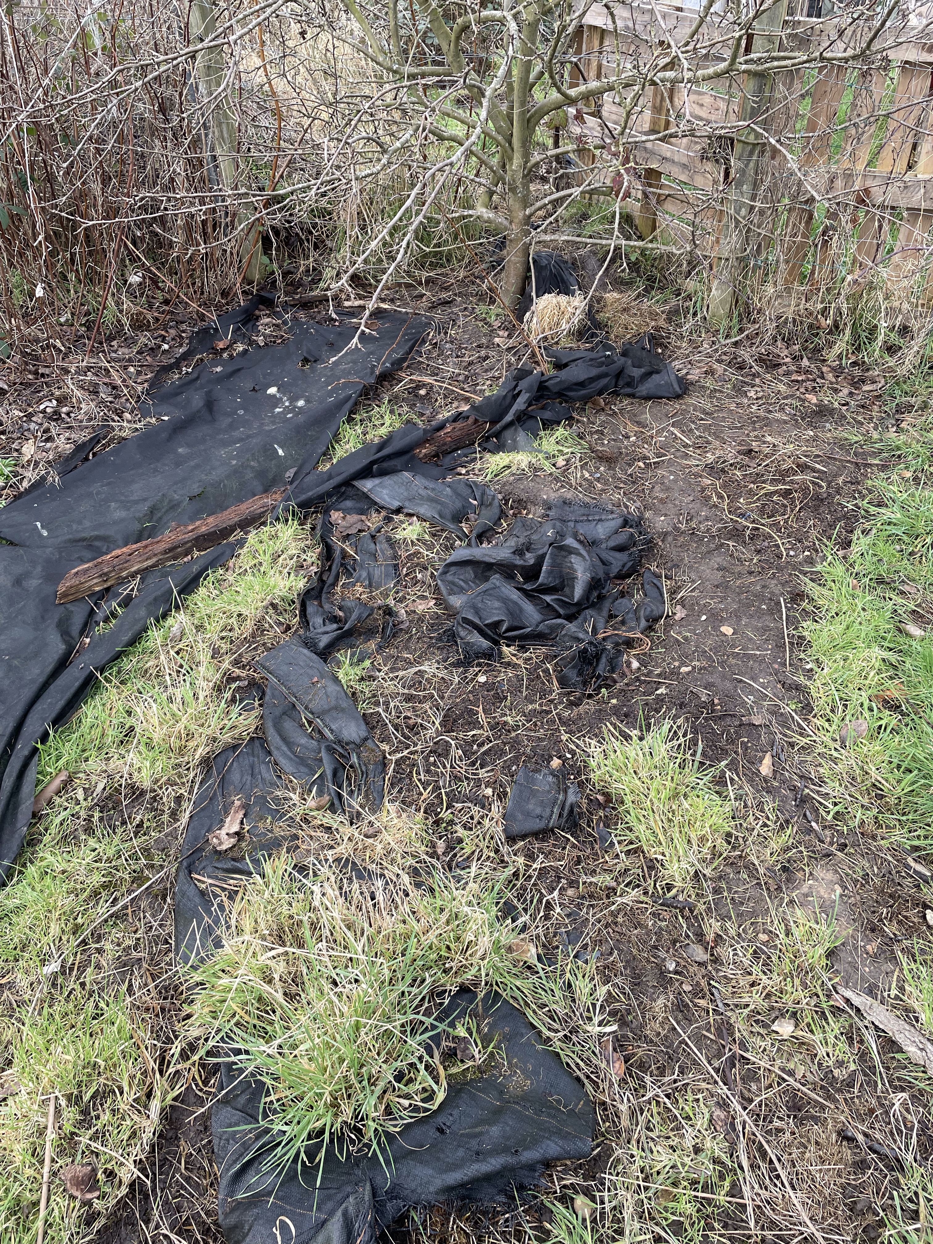 The other thing they took was weed control fabric. Yes, you read that right – weed control fabric. I had it covering two raised beds and the ground in front of the apple tree. Now, this was all pegged down and then weighted with broken paving slabs so it didn’t just blow away. Someone half inched it. Why? It’s cheap enough as it is.