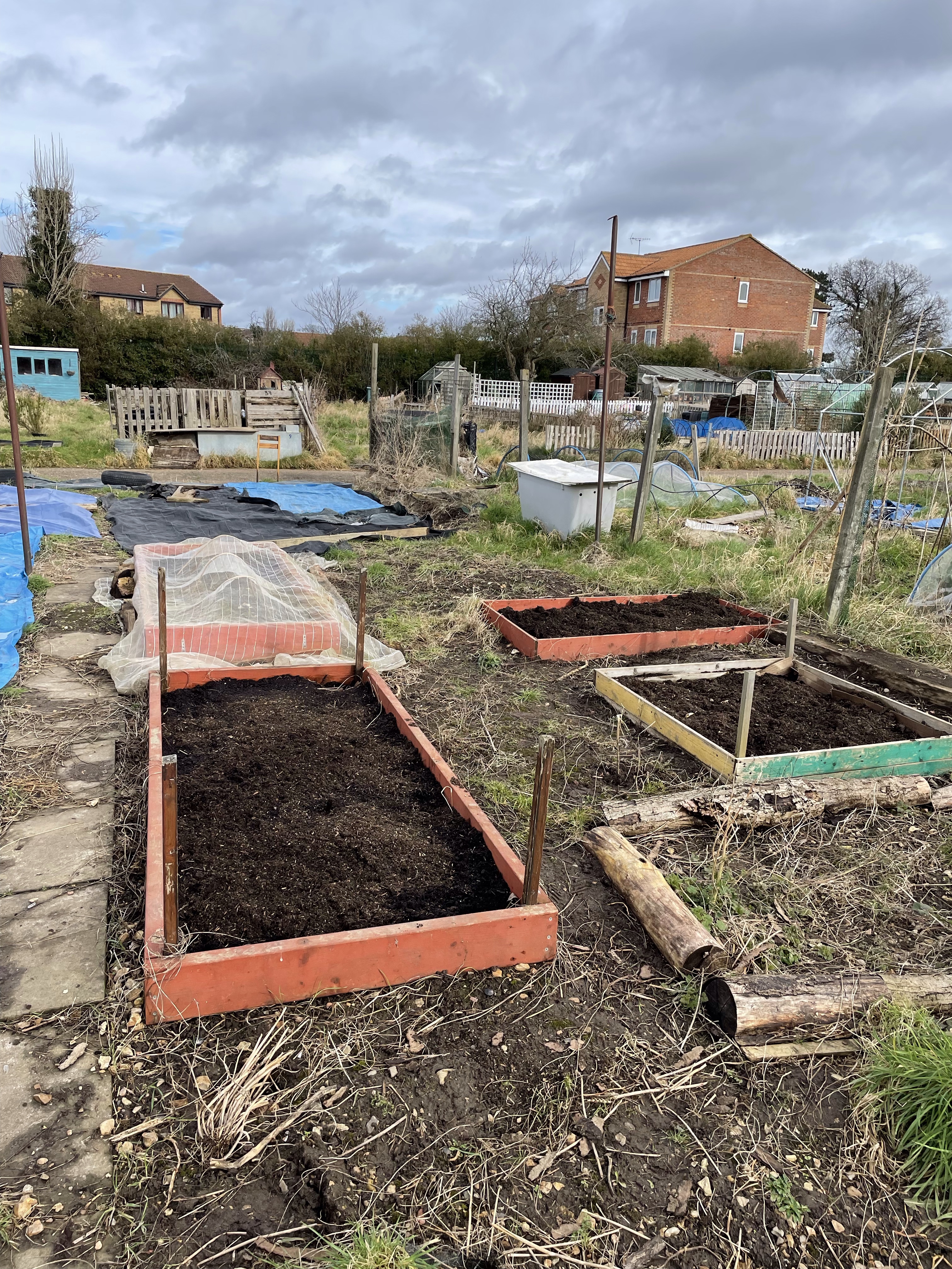 Just so I could feel like I am doing more than just covering stuff up I also planted one of the raised beds I got ready last time with some tulip bulbs. There was an offer on in the big orange DIY store to fill a bag with tulip bulbs for a couple of quid a while back so I figured why not? Can’t hurt to have a bit of colour, assuming they survive the cats from the houses behind the allotments and the foxes who are stalking the chickens on other plots. they all like to dig things up.